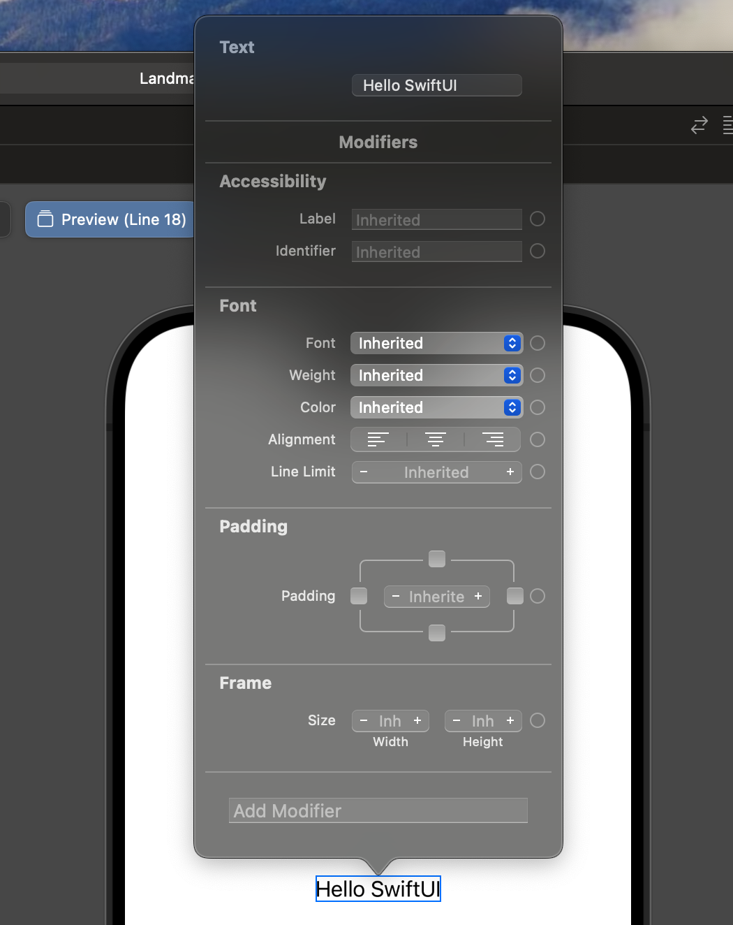 반대로 코드에 Control + 클릭해서 Show SwiftUI Inspector 창을 띄울 수도 있다.