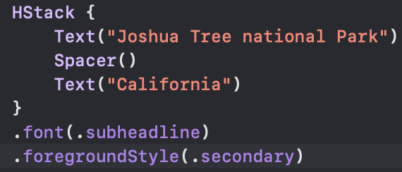 Text 뷰가 두개가 있지만 상위 뷰인 HStack에서 font와 foregroundStyle 속성을 선언할 수 있다. 또 공통적으로 선언할 수 있는 속성은 무엇이 있을지..